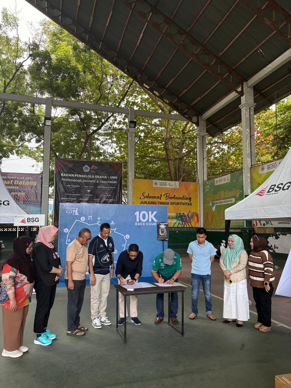 Penyerahan bantuan tersebut berlangsung di Lapangan Tennis Indoor Universitas Negeri Gorontalo dan diserahkan langsung oleh Direktur Pemasaran BSG, Bapak Pius Batara, bersama Pemimpin Divisi Pemasaran Dana BSG, Ibu Junikesumawati, dan diterima oleh pihak Kepala Badan Keuangan yang didampingi oleh Kabid Perbendaharaan. Kegiatan berlangsung di sela-sela persiapan pelaksanaan Bohusami Young Run.