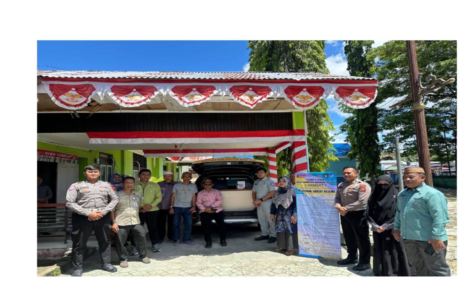 Ket Gambar : Foto bersama Camat Batudaa bersama jajarannya dan bersama unsur Kepoliaisn dan Jasa Raharja pada Samsat Kab Gtlo